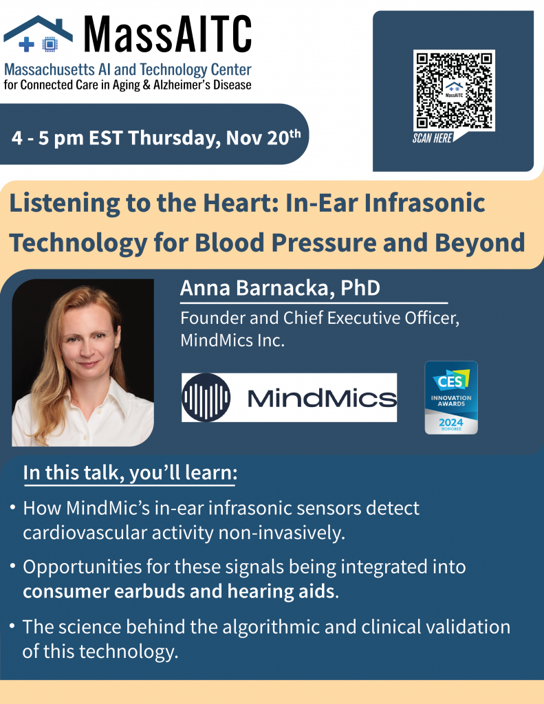 This talk will highlight the results of MindMics’ recent feasibility study on non-invasive blood pressure monitoring using in-ear infrasonic signals. Dr. Barnacka will discuss how this novel technology, validated through clinical research, can be integrated into both consumer earbuds and hearing aids, creating a new class of connected health devices. The presentation will explore the underlying infrasonic science, algorithmic advances, and the broader impact on cardiovascular health, preventive care, and data-driven wellness ecosystems.
