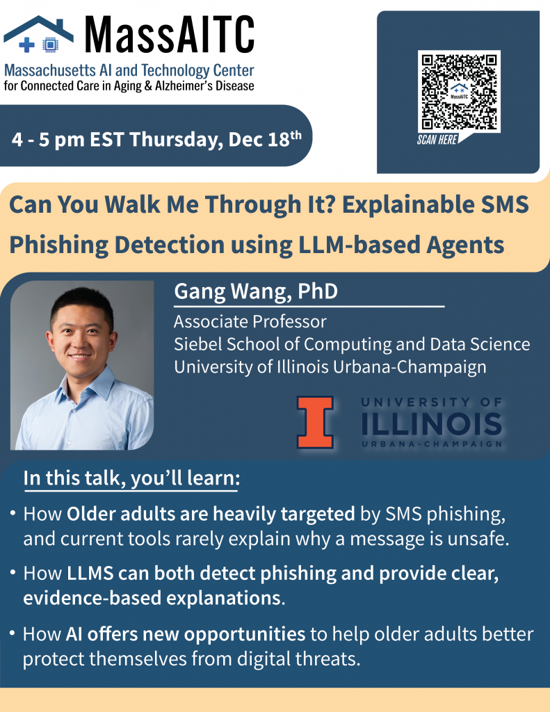 Phishing attacks pose a significant threat to users, especially older adults. Existing defenses mainly focus on phishing detection but often cannot explain to lay users why a message is malicious. In this talk, I will discuss how we use Large Language Models (LLMs) to detect SMS phishing while generating evidence-based explanations. The key challenge is that SMS is short, lacking the necessary context for security reasoning. We develop a prototype called SmishX that gathers external contexts to augment the chain-of-thought (CoT) reasoning of LLMs and facilitate the explanation process. I will further discuss our user studies to evaluate the effectiveness and usability of SmishX. Finally, I will discuss the open challenges and opportunities of using AI to help older adults better protect themselves from cybersecurity threats in general.