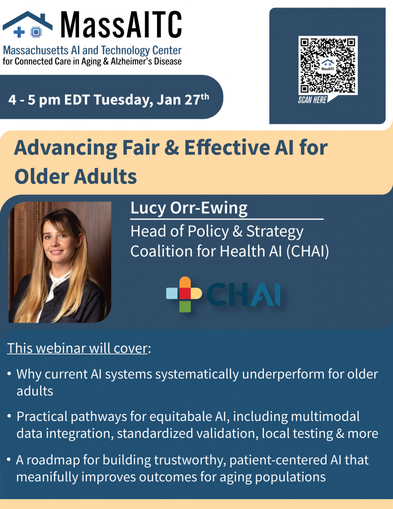 Artificial intelligence holds promise to transform care for older adults, yet today’s AI systems routinely underperform for this population due to poor data representation, limited validation, and weak alignment with lived experience. Drawing on a six-month collaboration between the SCAN Foundation, CHAI will be synthesizing evidence from literature review, expert interviews, and multi-stakeholder roundtables to surface why AI fails older adults—and what must change. They will outline practical pathways for building equitable AI, including multimodal data integration, standardized validation, local testing, and patient-centered deployment. The talk concludes with a roadmap for developing trustworthy AI that meaningfully improves outcomes for aging populations.