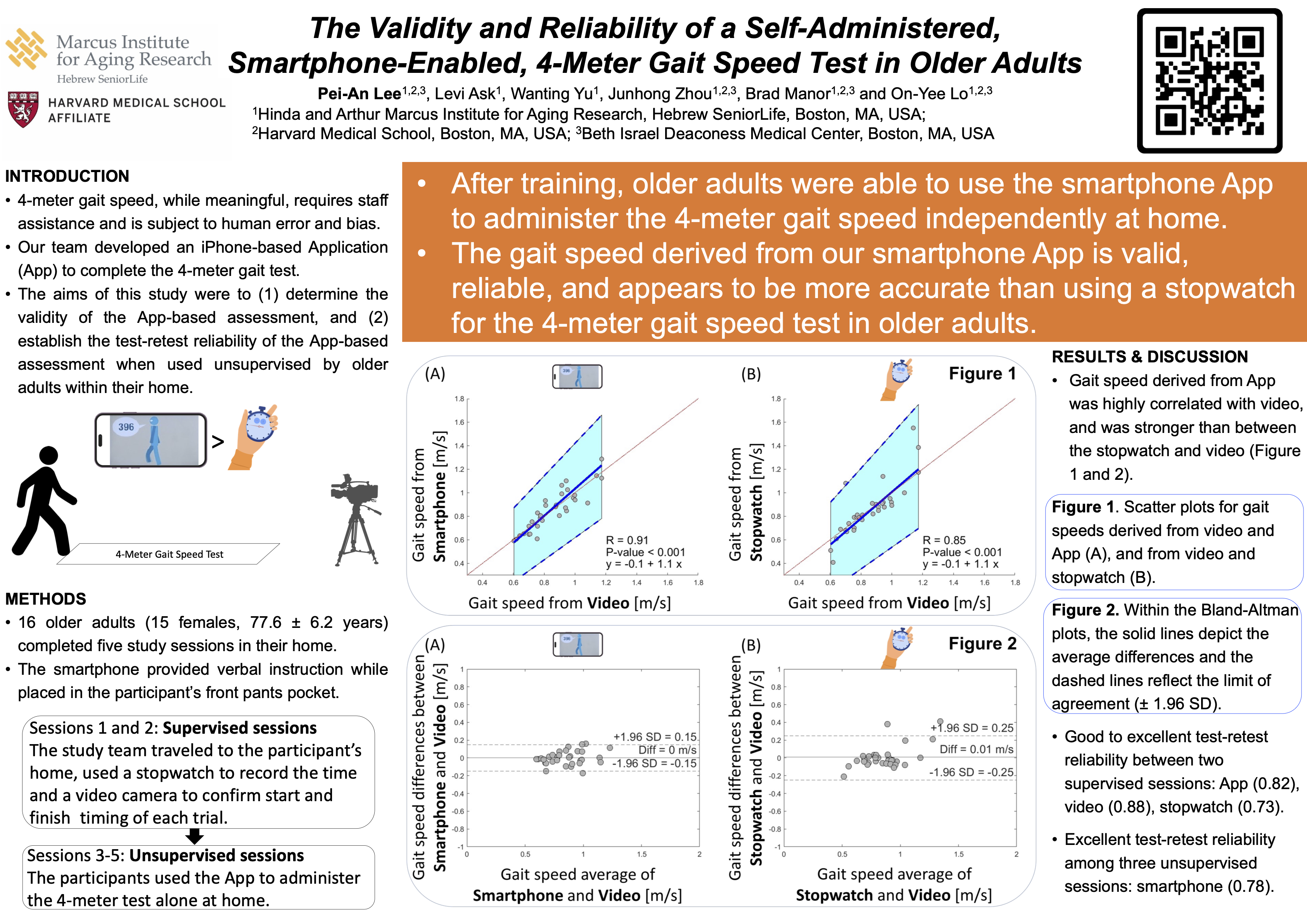 Our team developed a smartphone application (app) that uses the phone’s motion sensors to record movements during normal walking and walking while performing subtracting 3 from a random three-digit number (i.e. dual-task walking), with the phone placed in the user’s pants pocket. The app provided the user with multimedia instructions to complete the assessment. This presentation will demonstrate the app’s validity, reliability and applications. By enabling remote and repeated assessment of gait performance, we will highlight its potential for early detection of mobility and neurologically related declines, as well as for monitoring improvements in gait over time following interventions.