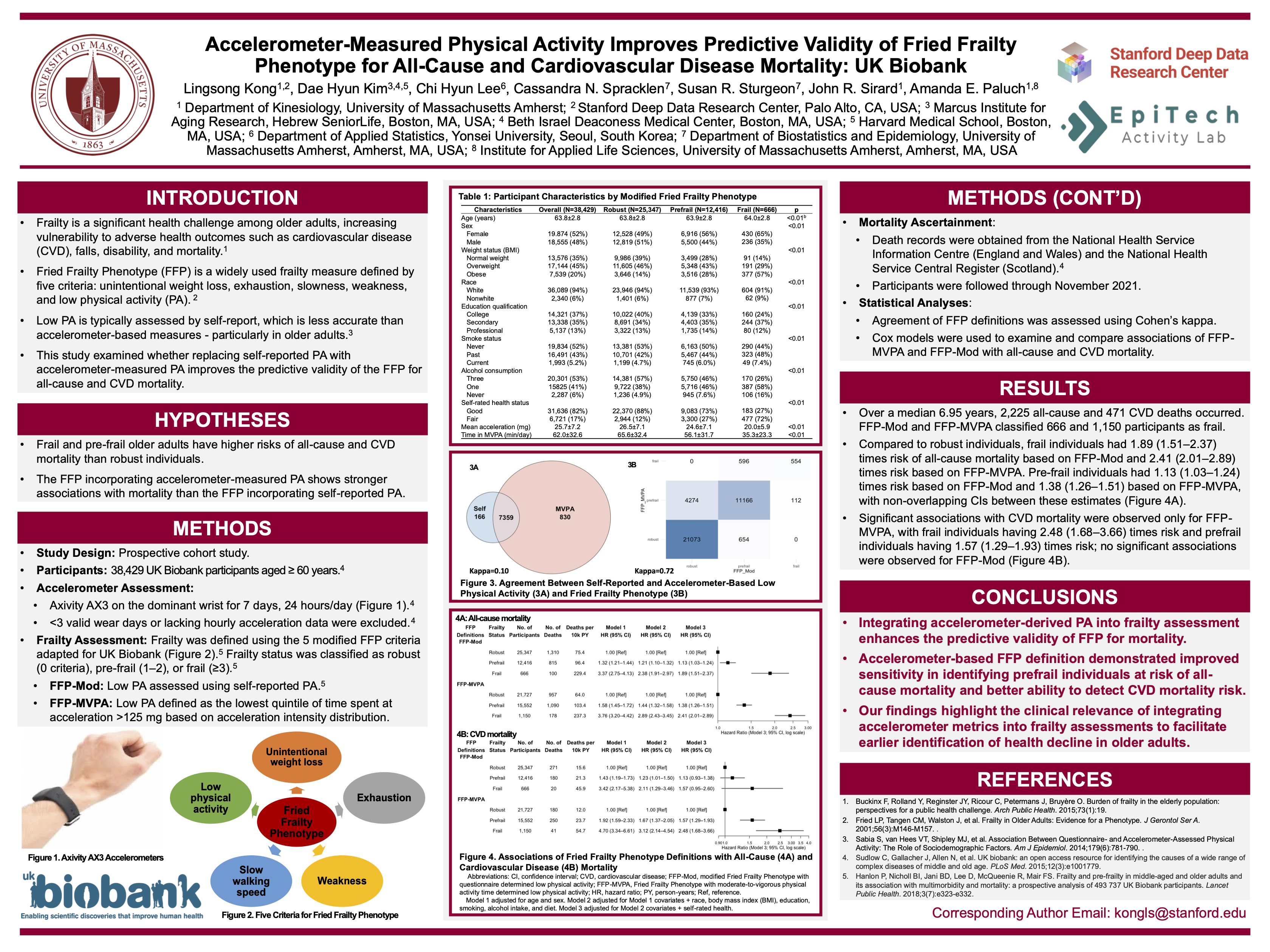 This prospective cohort study examined whether accelerometer-measured physical activity (PA) improves the predictive validity of the Fried Frailty Phenotype (FFP) for mortality compared with self-reported PA. The sample included 38,429 UK Biobank older adults (63.8±2.8 years; 48% male) with valid accelerometer and frailty data. Frailty was defined using five FFP criteria (frail ≥3; prefrail 1–2; robust 0) under two definitions: questionnaire-based FFP (FFP-Mod) and accelerometer-based FFP (FFP-MVPA), with low PA defined as the lowest quintile of moderate-to-vigorous PA. Over a median 6.95-year follow-up, 2,225 all-cause and 471 cardiovascular disease (CVD) deaths occurred. Compared with robust individuals, frail individuals had higher all-cause mortality risk under both FFP-Mod (HR 1.89, 95% CI 1.51–2.37) and FFP-MVPA (HR 2.41, 95% CI 2.01–2.89). Prefrail risk was higher for FFP-MVPA (HR 1.38, 95% CI 1.26–1.51) than FFP-Mod (HR 1.13, 95% CI 1.03–1.24). Only FFP-MVPA–defined prefrailty (HR 1.57, 95% CI 1.29–1.93) and frailty (HR 2.48, 95% CI 1.68–3.66) predicted CVD mortality. Integrating accelerometer-derived PA enhances the mortality predictive validity of FFP.