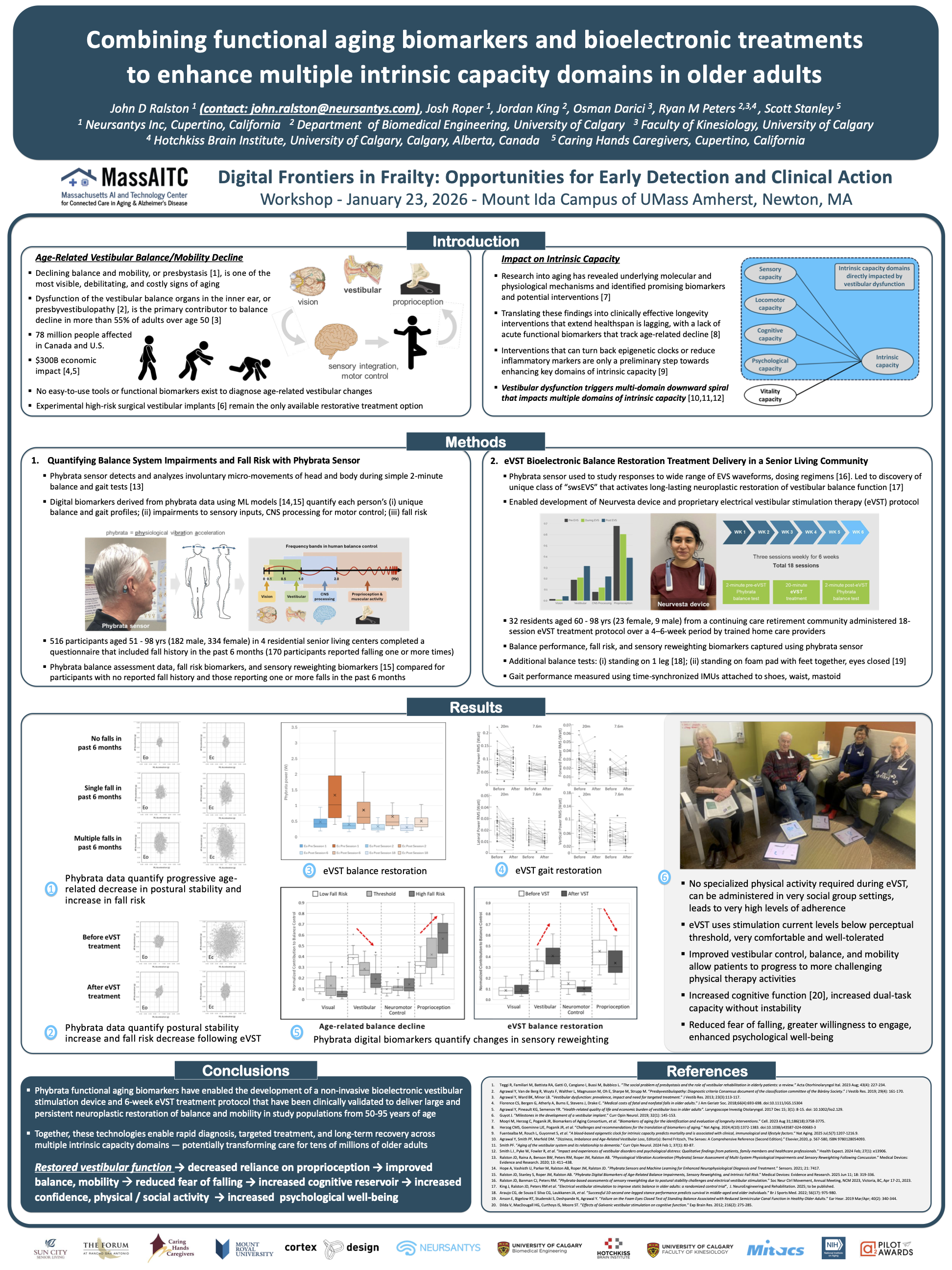 This poster presents novel functional aging biomarkers and bioelectronic treatments that have been successfully combined to activate neuroplastic restoration of multiple domains of intrinsic capacity in older adults. A new class of digital biomarkers using a head-mounted “phybrata” wearable sensor is used to quantify impairments to multiple physiological systems that contribute to degraded intrinsic capacity. Phybrata biomarkers have enabled development of a non-invasive bioelectronic vestibular stimulation device and 6-week treatment protocol that have been shown to deliver large and persistent neuroplastic restoration of sensory, locomotor, cognitive, and psychological domains of intrinsic capacity in study populations from 50-95 years of age.