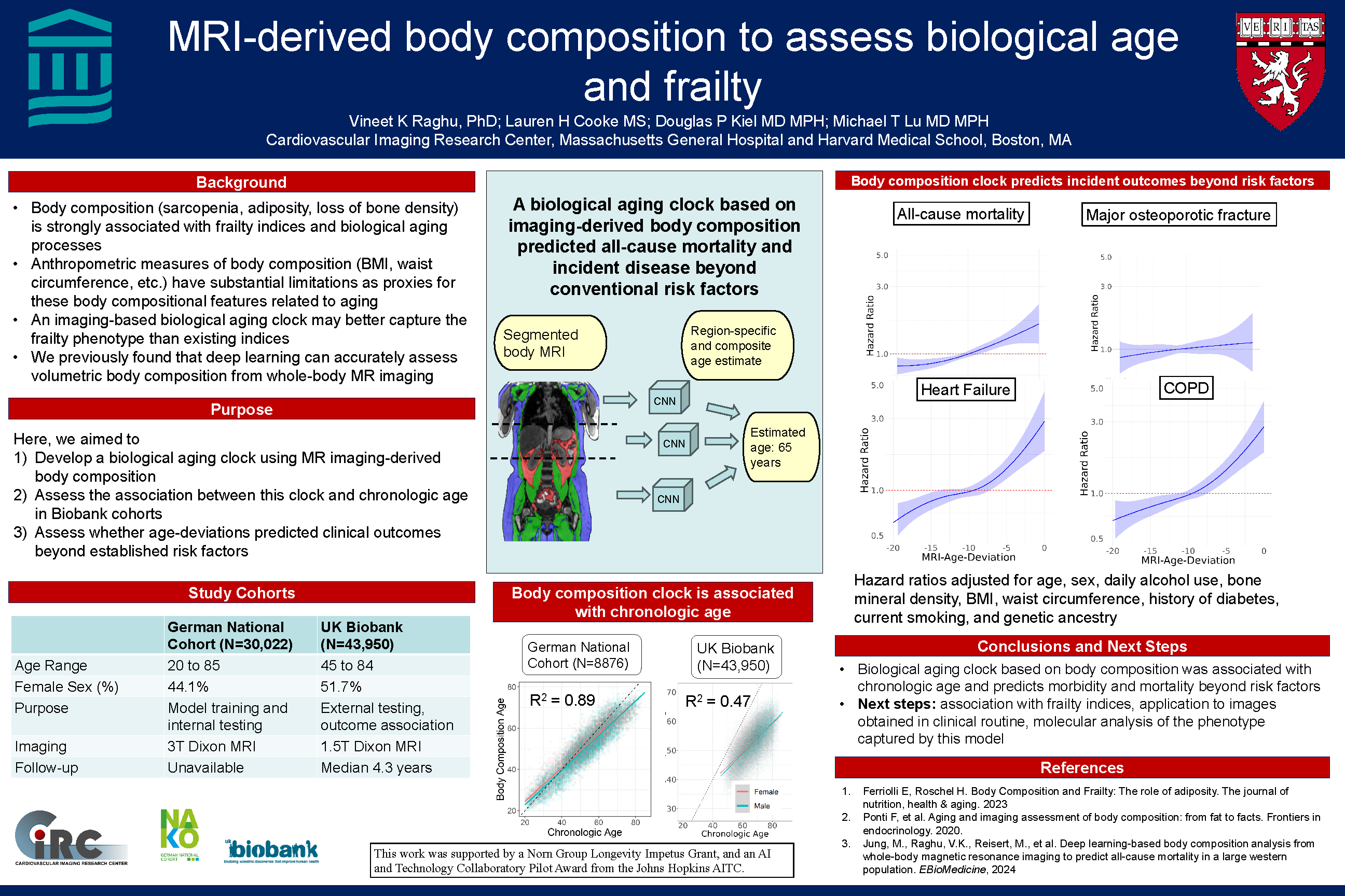 Chronologic age is an imperfect measure of biological processes underlying aging; measures of biological age are needed. The distribution of adipose tissue and muscle have well-established associations with aging, and non-invasive imaging (e.g., CT, MRI) coupled with deep learning tools provide a unique opportunity to measure body composition at scale and study how body composition changes with age. We used a publicly available tool to extract fat and muscle masks from 30,452 German National Cohort (NAKO) participants (aged 20-85) and 43,950 UK Biobank (UKB) participants (aged 45-84). We developed a deep learning model to estimate biological age based on these masks in the NAKO and externally tested this model in the UKB. We found that this body composition age was strongly associated with chronological age (NAKO R2 0.89, UKB R2 0.67). After adjustment for conventional risk factors, UKB participants in the top 20th percentile of biological age had a 2-fold higher hazard for all-cause mortality, incident heart failure, diabetes, and COPD.
