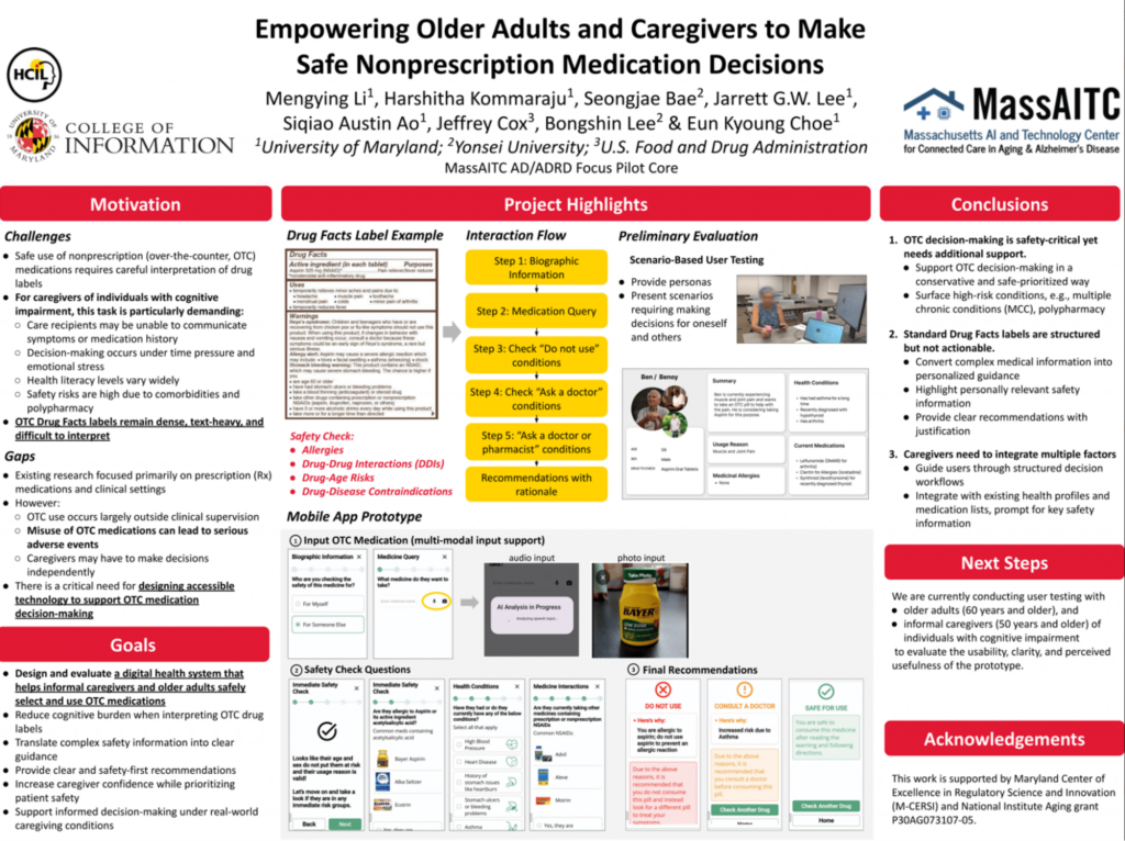 Title: Empowering Older Adults and Caregivers to Make Safe Nonprescription Medication Decisions Authors: Mengying Li, Harshitha Kommaraju, Seongjae Bae, Jarret Lee, Siqiao Austin Ao, Jeffrey Cox, Bongshin Lee, & Eun Kyoung Choe